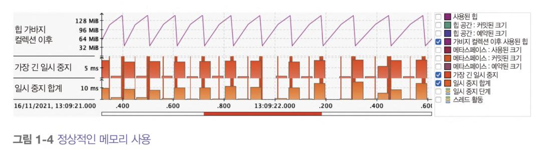 스트레스 받지 않는 정상적인 애플리케이션에서 메모리 사용량이 '톱니형' 패턴으로 나타나게 만듭니다. (p42)