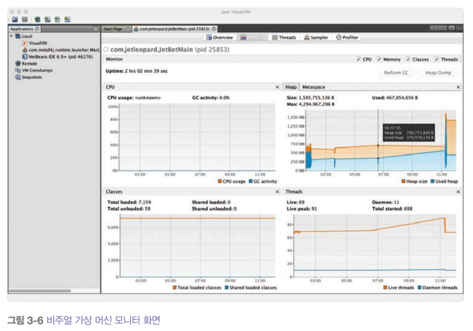 도구 관점에서는 VisualVM과 같은 JVM 모니터링 툴을 중심으로, JMX, 자바 에이전트, JVMTI 등 다양한 계측 수단이 소개됩니다. 특히 VisualVM은 실제로 사용해볼 수 있는 가시적인 도구이고, 각 탭(모니터링, 스레드, 프로파일링 등)의 역할이 명확히 구분되어 있어 초심자에게도 좋은 입문서가 될 수 있다고 느꼈습니다.