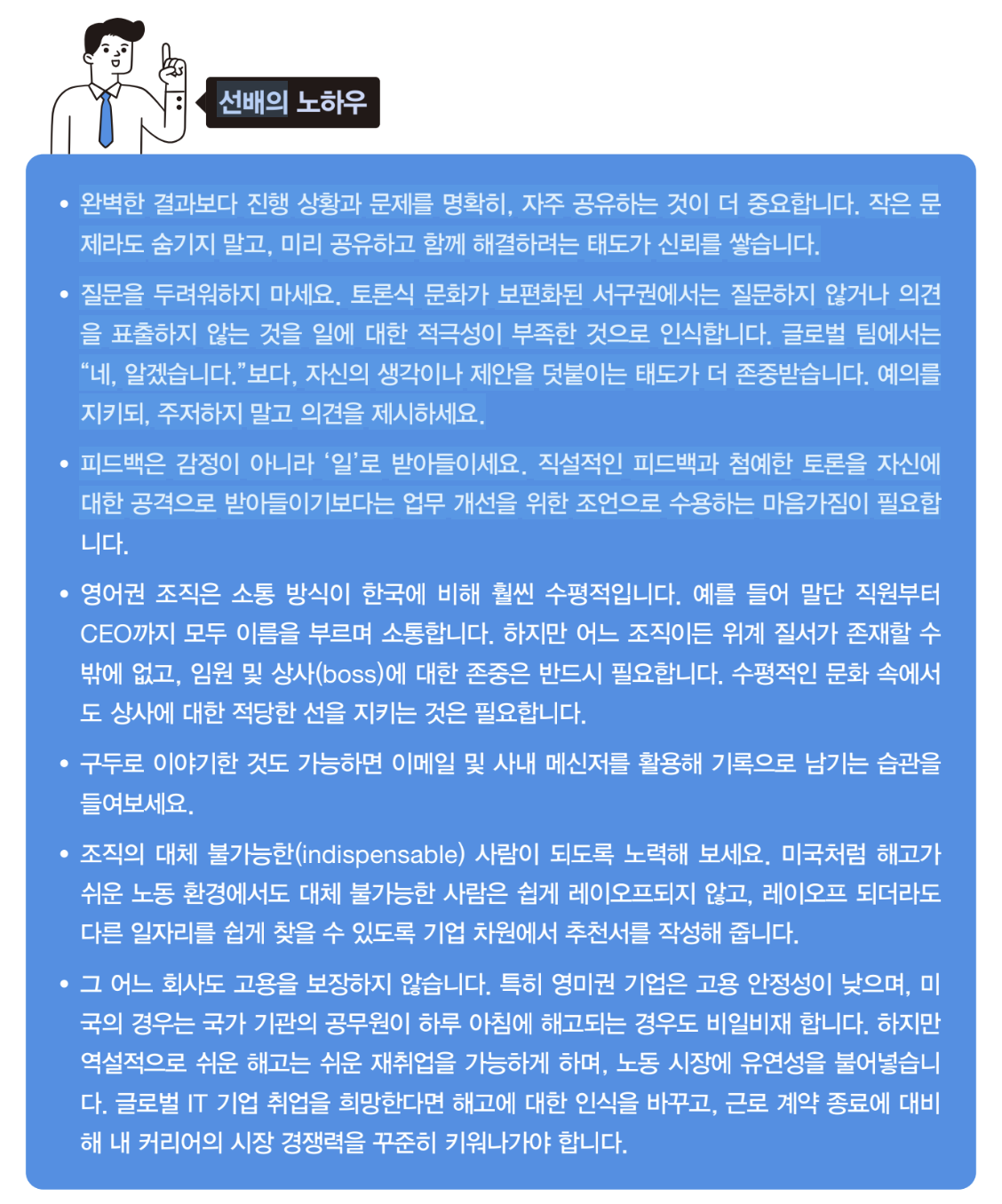 이어지는 챕터 4에서는 글로벌 기업과 한국 기업 간의 문화 차이에 대해 다루며, 글로벌 개발자로 일할 때의 커뮤니케이션 방식과 업무 마인드를 소개합니다. 특히 ‘동료 개발자의 마음을 얻는 커뮤니케이션’이라는 표현처럼, 단순히 영어 문장을 잘 쓰는 것을 넘어서 상호 존중과 배려를 기반으로 한 소통 방식이 강조되는 점이 인상 깊었습니다. 또한, 개인주의와 공동체주의의 차이, 사생활 관련 질문을 피하는 문화적 규범 등은 글로벌 협업 시 꼭 알아야 할 문화적 맥락을 이해하는 데 도움을 줍니다. 언어만이 아니라 사고방식의 전환까지 다뤄준다는 점에서 챕터 4는 단순 영어 학습서가 아닌 커리어 가이드로서의 가치를 느낄 수 있었습니다.
