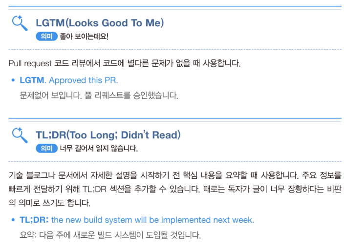 또한 ‘개발자 커뮤니티 인싸로 도약하는 인터넷 속어’ 섹션에서는 한국의 줄임말처럼, 오픈소스 커뮤니티나 개발 포럼에서 자주 보이지만 쉽게 이해하기 어려운 인터넷 약어들을 정리해 소개합니다. 예를 들어 LGTM, TL;DR 같은 표현들이 어떻게 사용되는지 실제 맥락과 함께 제시해 주어, 무심코 지나쳤던 표현들의 의미를 제대로 이해할 수 있어 재미있었습니다