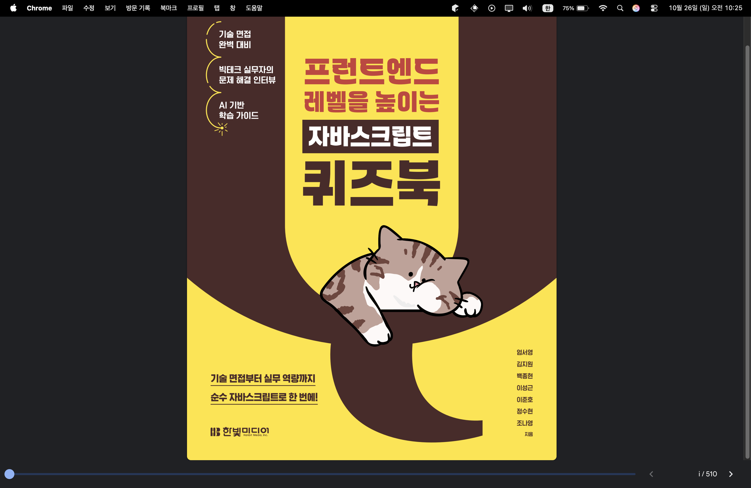 실무에서 백엔드와 프론트엔드 구현을 병행하면서 항상 마음 한편에는 '프런트엔드 기본기를 내가 제대로 갖추고 있는가?' 하는 근본적인 불안감이 자리 잡고 있었습니다. 백엔드의 경우 자체적인 학습을 통해 기본기부터 테스트, 리팩토링, 설계에 이르기까지 비교적 안정적인 학습 로드맵을 구축할 수 있었습니다. 하지만 프런트엔드 영역만큼은 최신 트렌드가 너무 빠르게 변해, 방대한 지식 중 어디서부터 지식을 체계화해야 할지 막막함이 컸습니다.그러던 중, 한 IT 지식 공유자가 운영하는 오픈 채팅방에서 [프런트엔드 레벨을 높이는 자바스크립트 퀴즈북] 출판 소식과 추천을 접하게 되었고, 프론트 엔드 지식과 방향성을 점검하기 위해 읽게 되었습니다.