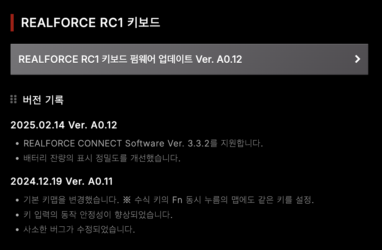 키보드의 성능 및 안정성을 최신 상태로 유지할 수 있는 펌웨어 업데이트 기능 또한 공식적으로 지원됩니다. 마찬가지로 공식 홈페이지에서 최신 펌웨어 파일을 다운로드한 후, 소프트웨어 툴을 통해 쉽게 실행하고 업데이트를 진행할 수 있는 것으로 보였습니다.