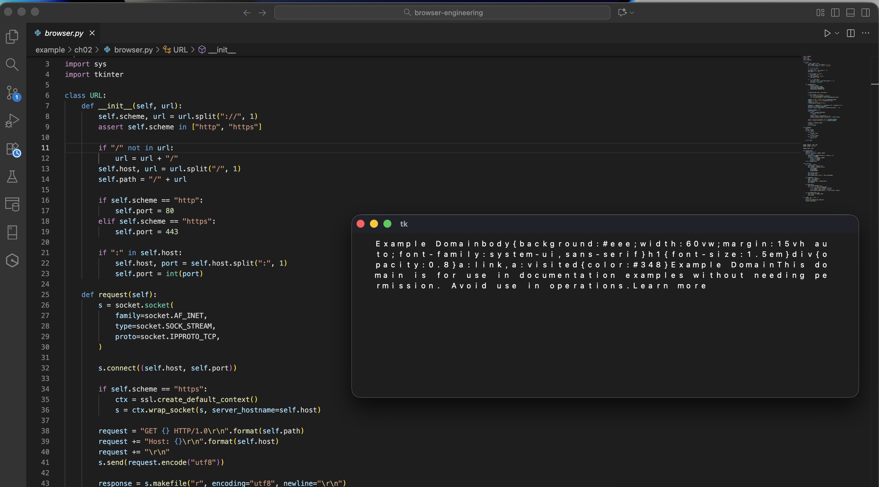 챌린지에서는 파이썬 언어와 VSCode를 활용하여 챕터별 예제를 구현했습니다. (mac 기준) 초기 단계에서 다소 난항이 있었는데, 예제를 실행하는 데 필요한 tcl-tk를 설치했음에도 불구하고 정상적으로 동작하지 않는 문제가 발생했습니다. 다행히 python-tk를 설치하자 원하던 예제 결과물을 확인할 수 있었고, 사소하지만 중요한 트러블슈팅 경험을 얻을 수 있었습니다. 이후 폰트 사이즈에 맞춰 텍스트가 브라우저에 그려지는 코드를 직접 구현해보면서, 결국 웹 브라우저라는 거대한 결과물 역시 하루아침에 만들어진 것이 아니라, 점진적인 기능 구현, 리팩터링, 그리고 확장의 과정을 통해 완성되었다는 진리를 경험해 볼 수 있어 좋았습니다.