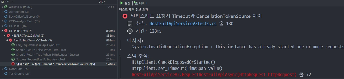 아직 task1의 통신이 끝나지 않은 상태에서 task2가 HttpClient (싱글톤 객체)의 Timeout(공유 필드)를 변경하려고 한 게 원인이었습니다.