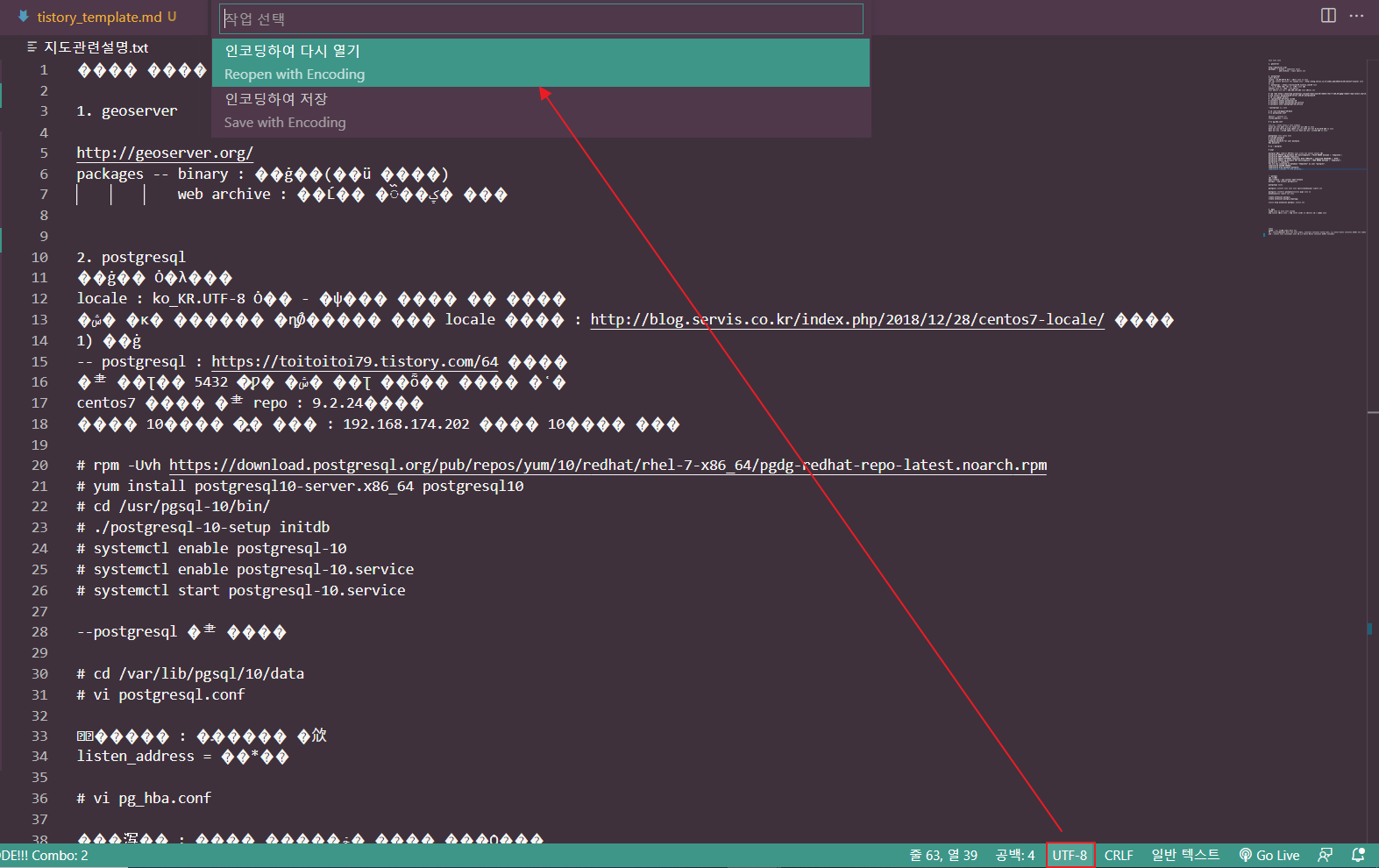- 인코딩하여 다시 열기(Reopen with Encodig) 선택