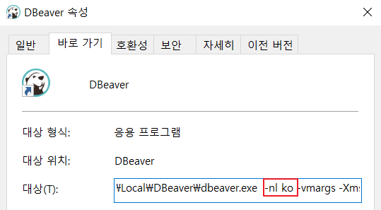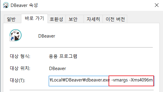- 바탕화면에 있는 'DBeaver 바로가기' 아이콘 오른쪽 마우스 클릭 → [속성]
