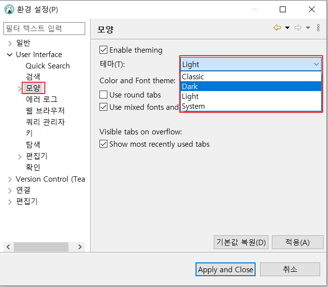 - [윈도우] → [설정] → (왼쪽) [User Interface] → [모양] 메뉴 선택 후 테마 변경
