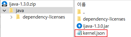 - 압축 푼 ijava-1.3.0 폴더 안에 있는 kernel.json 파일을 메모장으로 열어서 설정 변경해줌 (아래 내용 참고 )