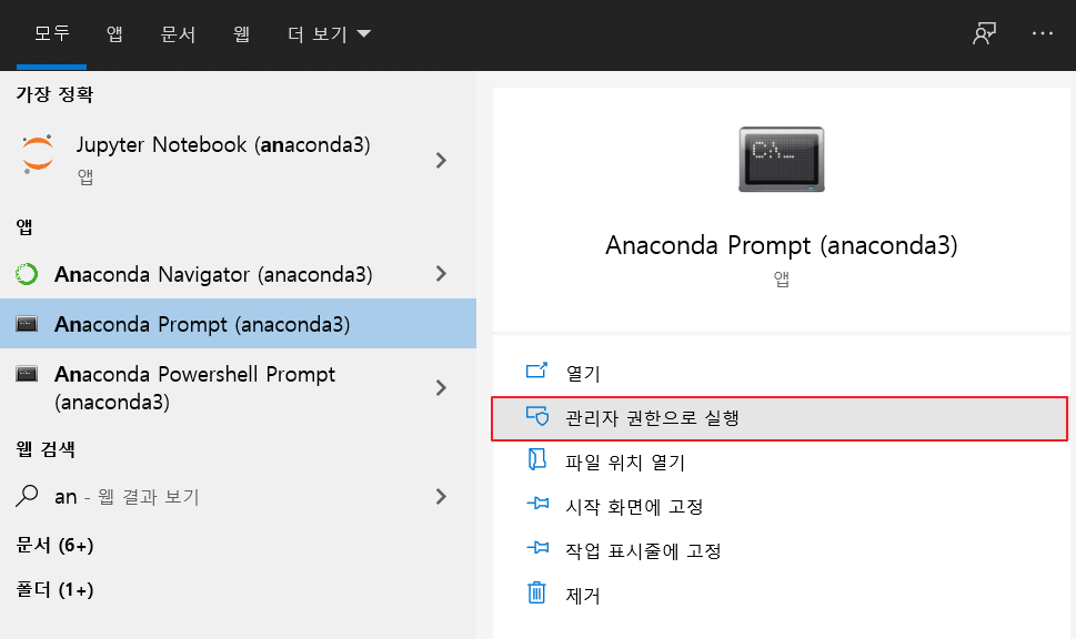 - 명령어는 아래 Anaconda prompt 에서 전부 처리함 ( 관리자 권한으로 실행할 것 ! )