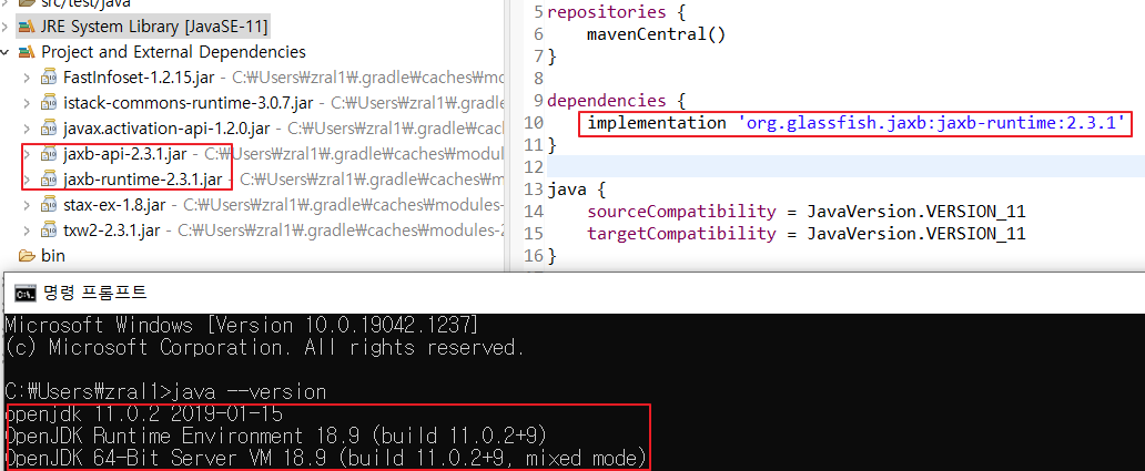 - 다시 cmd 창 확인 후 gradle.build 재실행시 정상동작 확인함