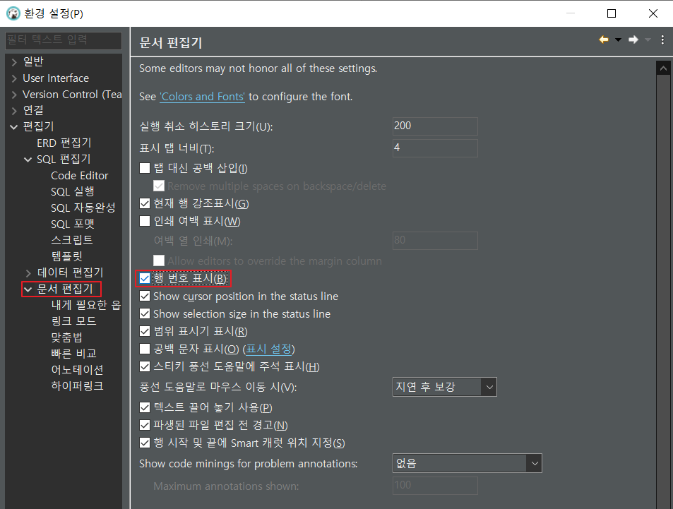 - 상단 메뉴 [윈도우] > [환경설정] > 팝업창 좌측메뉴 [편집기] > [문서편집기] 선택