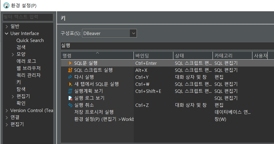 - DBeaver에서 지정해 놓은 단축키를 사용자 정의 할 수 있음