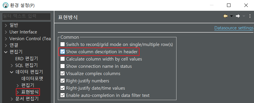 - 상단 메뉴 [윈도우] > [환경설정] > 팝업창 좌측메뉴 [편집기] > [데이터 편집기] > [표현방식] 선택