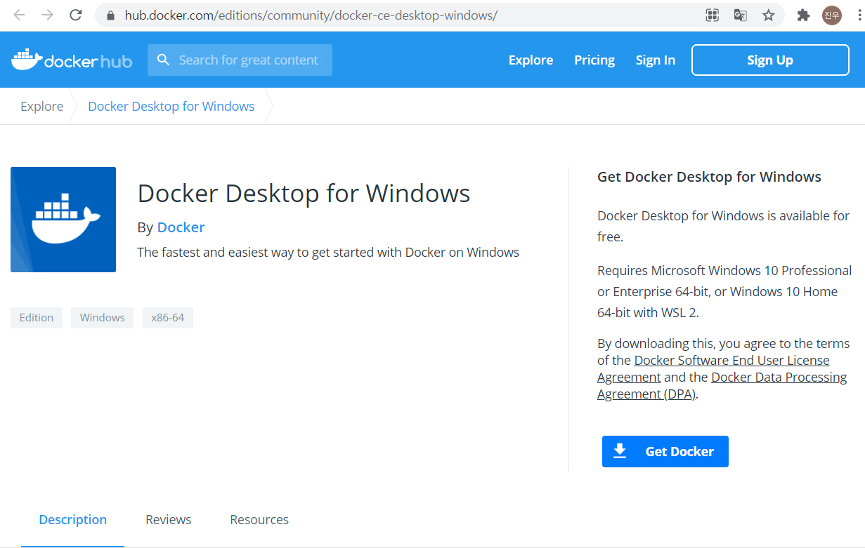 아래 링크 통해 Desktop Docker 다운로드/설치