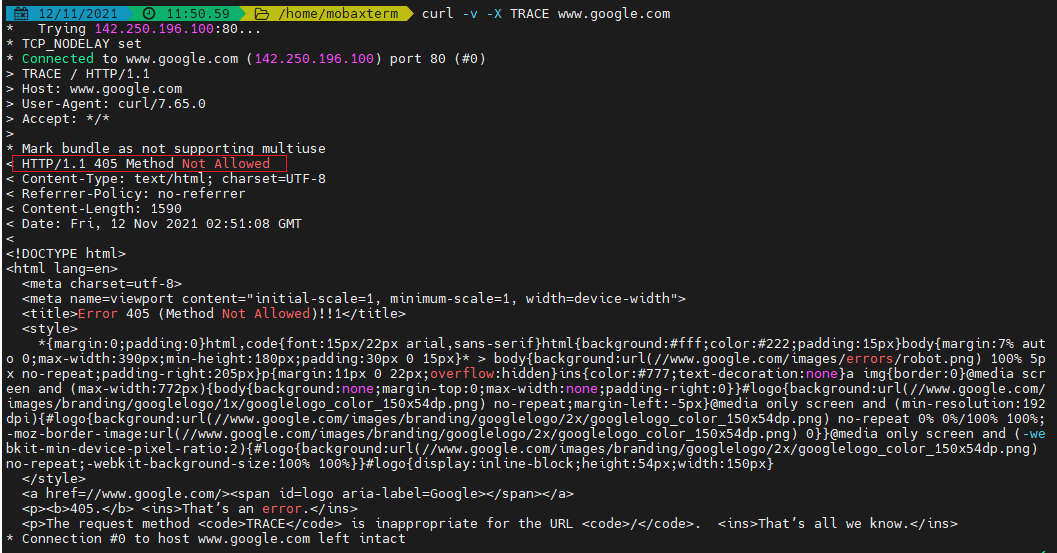 $ curl -v -X TRACE www.google.com // 405 Method Not Allowed 출력됨