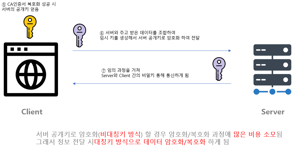 ∴ 서버 인증은 비대칭키 방식, 서버와 클라이언트간의 데이터 교환은 대칭키 방식
