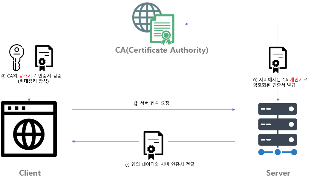 ※ 인증서 검증이 되지 않는 경우 브라우저에 "신뢰할 수 없는 사이트 표시" 출력됨 (브라우저에 검증된 CA 목록있다함)